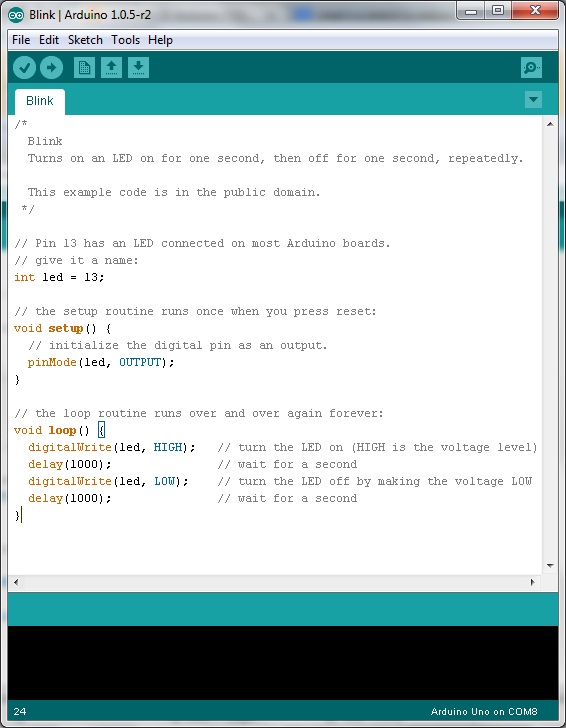 In the automatic way all you do is open up the Arduino IDE and Navigate to File -> Examples -> 01. Basics -> Blink